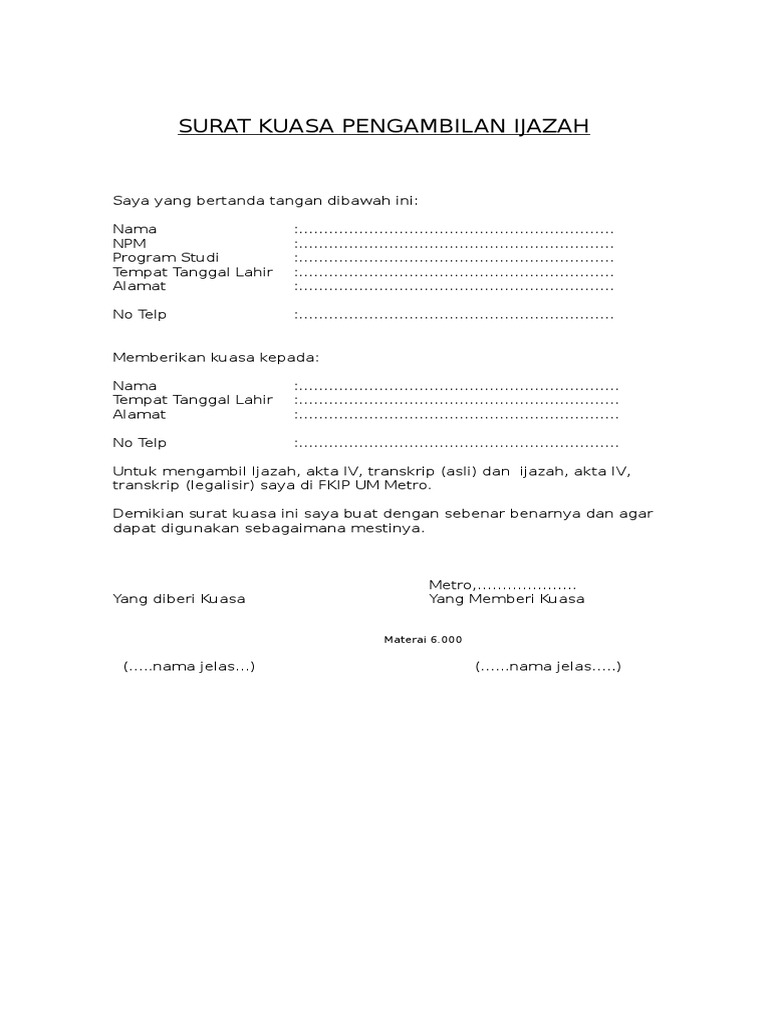 Jika diatas saya sudah memberikan beberapa contoh surat kuasa pengambilan ijazah yang sudah terisi, maka disini anda bisa mengambil contoh format dari surat. Seperti pengambilan ijazah, bpkp, bank, perwakilan, pengambilan dokumen maupun untuk yang lainnya. Untuk mengambil ijazah asli, transkrip nilai, beserta fotokopi ijazah dan dokumen lain yang telah dilegalisasi serta menandatangani segala surat yang terkait dengan pengambilan ijazah. Mungkin diantara kalian ada yang sering mengambil uang pribadi di bank namun anda sedang berhalangan. Surat kuasa yang harus anda buat sama halnya ketika anda ingin membuat 3 contoh surat kuasa pengambilan bpkb terbaru meskipun. Pada umumnya surat kuasa berhubungan. Surat kuasa sendiri merupakan salah satu surat yang dapat mewakili seseorang ketika terjadi kendala dalam pengurusan sesuatu. Anda tinggal melihat format penulisan dibawah ini untuk menulisnya. Contoh surat kuasa pengambilan dokumen. Untuk dapat mengambil ijazah asli beserta transkrip nilai dan menandatangani dokumen atau berkas yang berkaitan dengan pengambilan ijazah saya di. Ijazah biasanya baru bisa diberikan beberapa minggu atau bulan setelah mahasiswa di wisuda karena harus melalui proses legalisasi yang tentu. Contoh surat kuasa pengambilan ijazah. Untuk pengambilan dokumen berupa ijazah asli, transkip nila serta fotokopi yang telah.